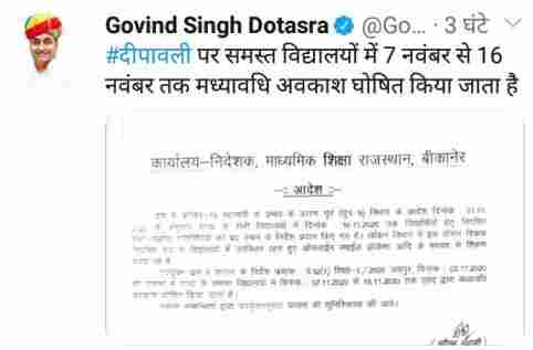अभी आपको पूरी जानकारी दी जाएगी कि राजस्थान के 10वीं व 12वीं ओपन बोर्ड का रिजल्ट कब जारी किया जाएगा, उससे पहले आपको बता दें कि राजस्थान के शिक्षा मंत्री श्रीमान गोविंद सिंह डोटासरा ने भी इसकी ऑफिशियल टि्वटर हैंडल के माध्यम से जानकारी प्रदान की है | आप नीचे माननीय शिक्षा मंत्री श्रीमान गोविंद सिंह डोटासरा का ऑफिशियल टि्वटर अकाउंट के ट्वीट का स्क्रीनशॉट देख सकते हो |